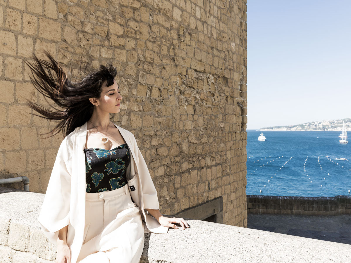 動くたびに風を含み、しなやかに揺れるジャケットは、まるで羽織る風のよう。体に優しく馴染み、着心地の良さとエレガンスを両立しています。
