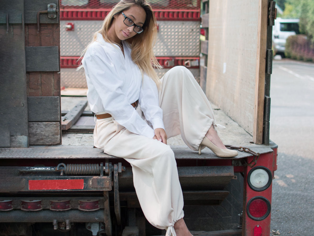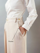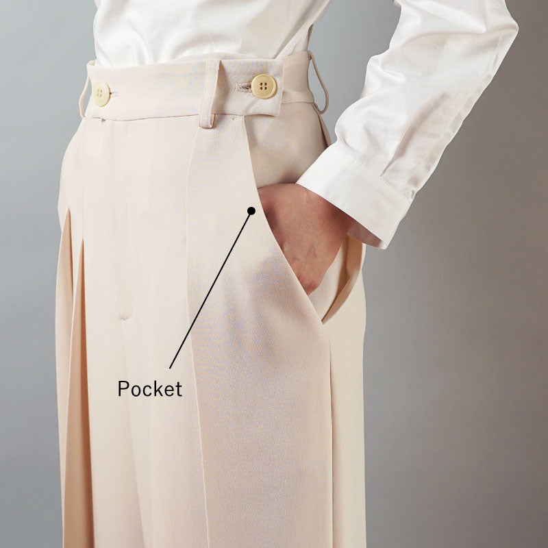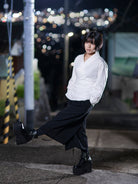 着物の袴が持つ「動きやすさ」と「優雅さ」を現代の洋服のパターンに落とし込みました。緩やかに広がるワイドシルエットながら、野暮ったさを感じさせない洗練されたライン。歩くたびに美しく揺れるシルエットは、スタイルをより一層引き立てます。
