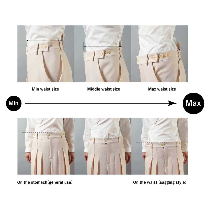 その開いたスリットをウエストで止める機構に3つのボタンでサイズが何段階にも調整することによりウエストと腰という幅の違う箇所で履ける様に出来ないかとデザインとパターンを繰り返し試行錯誤していきました。