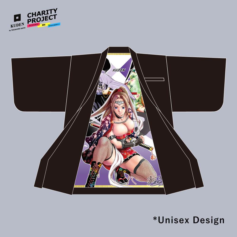 Samurai Mode Jacket - Art Model -は、 今回のKUDENチャリティーを実施するご縁を頂き総裏の裏地をキャンバスにアニメーターや漫画家、 イラストレーターの先生達の絵がジャケットの裏地に載せることで、 ”現代の裏勝り”としてデザインされた特別なモデルとなります。
